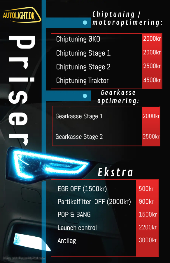 Du kan bestille en tid via vores Facebook-side eller via e-mail Shop@autolight.dk. Du kan også ringe på 71539054. Vores chiptuning udføres i samarbejde med Dk-chiptuning. For chiptuning på Sjælland. E-mail: info@dkchiptuning.dk. Hjemmeside: https://dkchiptuning.dk/. Trustpilot: https://dk.trustpilot.com/review/dkchiptuning.dk. Viborg filial: Autolight, Falkevej 13, 8800. Viborg. LED-lygter & chiptuning: +45 71539054. E-mail: shop@autolight.dk. Web: https://autolight.dk/. Trustpilot: https://dk.trustpilot.com/review/carlights.dk.