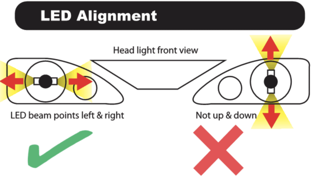 Her er nogle billeder af, hvordan LED’erne skal placeres i forlygtehuset. Følg vejledningen nedenfor, og juster dine forlygter. Hvis du ikke ser en skarp afgrænsning i lyset, kan du dreje pæren lidt til den ene eller den anden side, indtil du fÃ¥r den bedst mulige afgrænsning. Hvis du følger denne vejledning, er du sikker pÃ¥ ikke at blænde modkørende trafik.